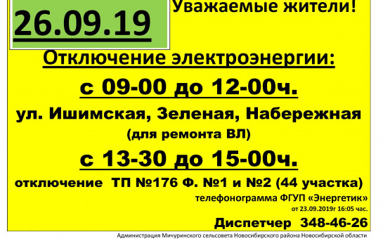 Отключение электроэнергии: с 09-00 до 12-00ч. ул. Ишимская, Зеленая, Набережная (для ремонта ВЛ) с 13-30 до 15-00ч. отключение ТП №176 Ф. №1 и №2 (44 участка) телефонограмма ФГУП «Энергетик» от 23.09.2019г 16:05 час. Диспетчер 348-46-26 |