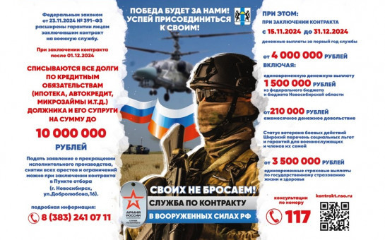 лицо, заключившее с 1 декабря 2024 года контракт о прохождении военной службы в Вооруженных Силах Российской Федерации на срок свыше одного года для выполнения задач СВО, и (или) его супруга (супруг) имеют право на списание (аннулирование) долгов по неисполненным кредитным обязательствам (ипотека, автокредит, микрозаймы и т.д.), на сумму не превышающую в совокупности 10 млн рублей. Также заключивший контракт на СВО имеет право на списание (аннулирование) задолженности по взысканию исполнительского сбора.*ОБЯЗАТЕЛЬНЫЕ УСЛОВИЯ:- контракт о прохождении военной службы в Вооруженных силах РФ для выполнения задач СВО заключен с 01 декабря 2024 года и на срок свыше одного года;- судебные акты о взыскании задолженности в отношении вышеуказанных лиц, вступили в законную силу не позднее 01 декабря 2024 года.В отношении всех военнослужащих, находящихся в зоне проведения специальной военной операции, исполнительные производства по иным задолженностям подлежат приостановлению. Отменяются аресты имущества, денежных средств.В целях оперативного прекращения исполнительных производств и снятия всех арестов и ограничительных мер, необходимо связаться с сотрудниками Главного управления ФССП России по Новосибирской области, воспользовавшись одним из способов: